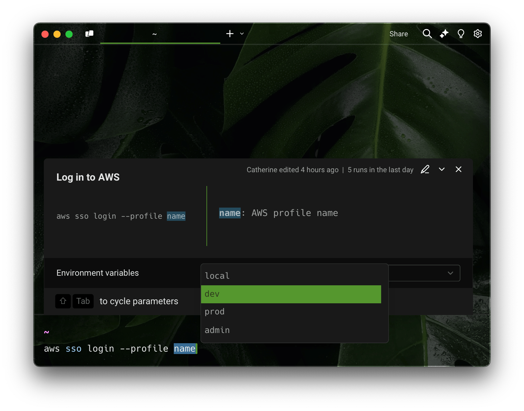 Switching between dev environments and worried about accidentally nuking your prod database? Warp’s environment variables can help. Similar to .env files, they let you: