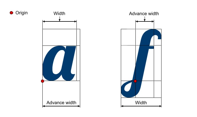 Typically, a glyph’s advance is greater than its width, but not always, as demonstrated above. (image source)