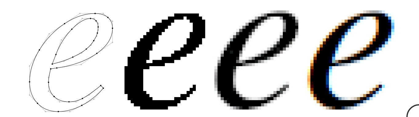 A vector representation of an “e” glyph, along with the outputs of bi-level, greyscale anti-aliased, and sub-pixel anti-aliased rasterization. (image source)