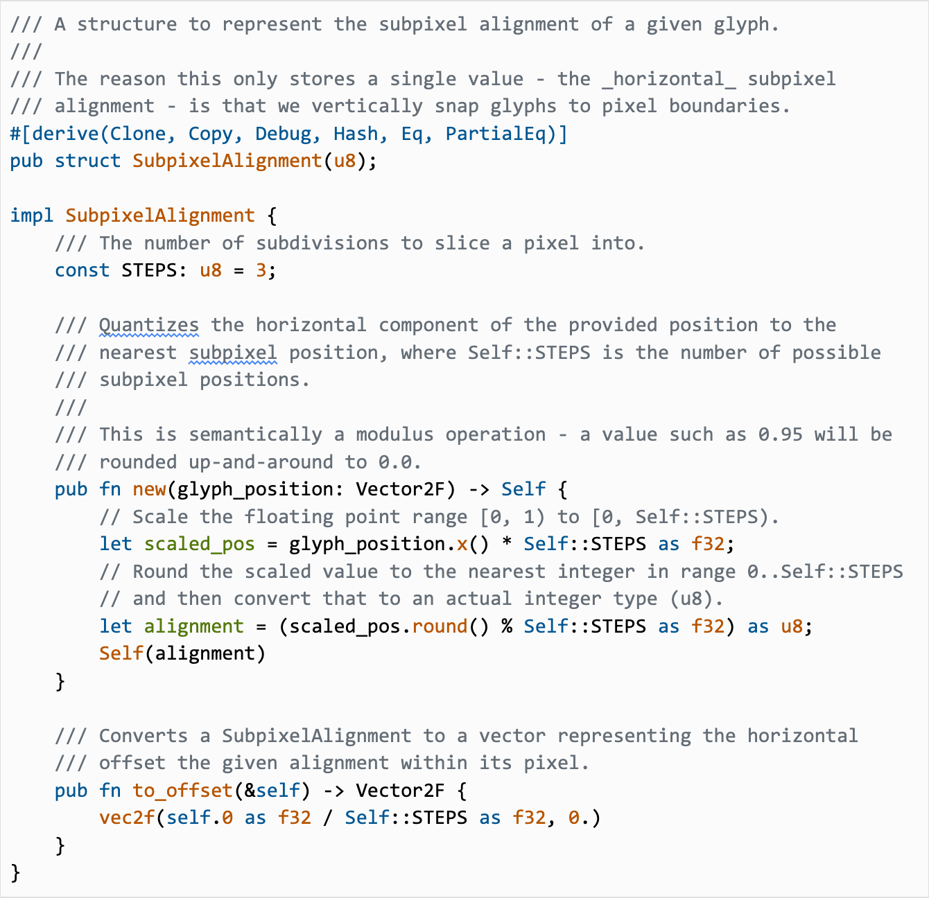 The code above is what I added to help us snap glyphs to a sub-pixel grid. Here, we split each pixel into 3 equally-sized subpixels, and round the horizontal position to the nearest subpixel (an offset of 0.0, 0.33, or 0.66px). Instead of using the full-precision fractional component of the glyph’s horizontal position in the cache key, we use the sub-pixel alignment, limiting the number of rasterized variants we pick from (and thus limiting the maximum increase in memory consumption). Now, when we’re rendering glyphs, we check the glyph atlas for sub-pixel aligned glyphs, and rasterize a glyph at the appropriate sub-pixel position if it isn’t present in the atlas.