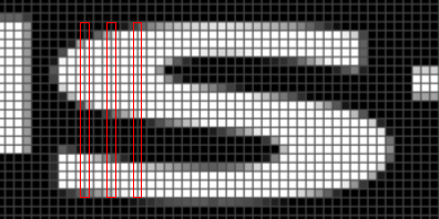 A section of a glyph atlas rendered with 3x scaling along the x-axis. The red boxes indicate where we would sample from.