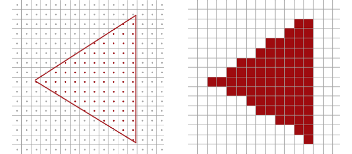 The simplest rasterization strategy is the following: for each pixel under consideration, check whether the center of the pixel lies within the vector outline.  If it is inside the outline, the pixel is turned on.  If it is outside the outline - even by the slightest margin - the pixel is completely ignored.  (This binary on/off is referred to as black-and-white or bi-level rasterization.)  While this is an easy computation, the results don’t look very good - a simple triangle starts to look messy when it doesn’t align nicely with the underlying pixel grid.  The triangle on the right is aliased, a term from signal processing used to describe inaccuracy caused by a misalignment between the signal frequency (our vector outline) and the sampling frequency (our pixel grid).
