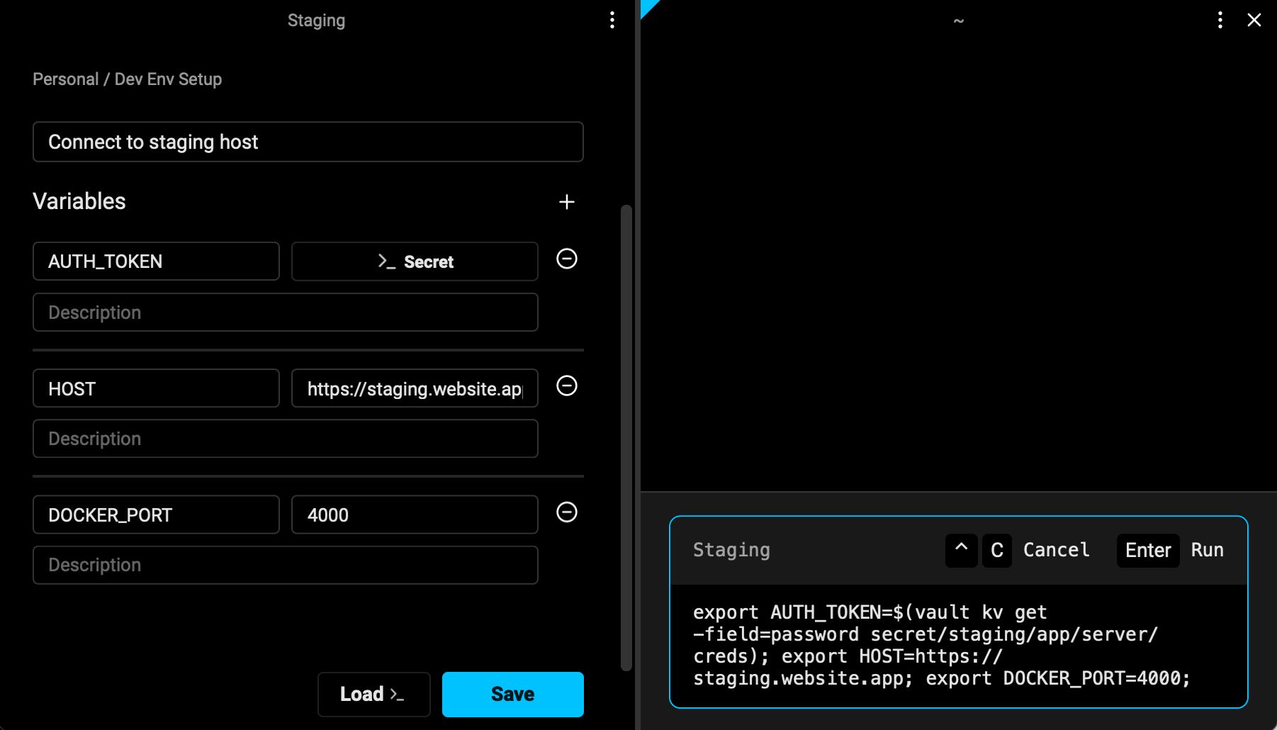 Workflows in Warp allow you to create parameterized commands you can run on-demand. Now, if you have environment variables saved, you will find the option to load those environment variables into your session along with any workflow.