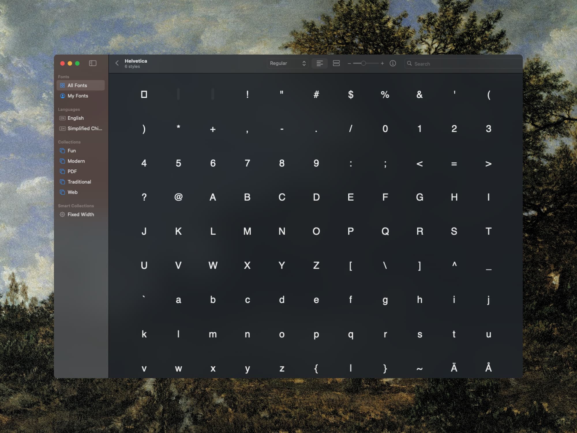 A preview of some of the glyphs available in Helvetica.