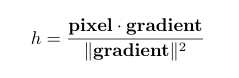 We want the variable h to represent the progression of the pixels along the direction of the gradient. To do so, the trick is to project the position of the pixel to the direction of the gradient. Pixels closer to the end of the gradient will have a larger magnitude and pixels closer to the start of the gradient will have a smaller magnitude.