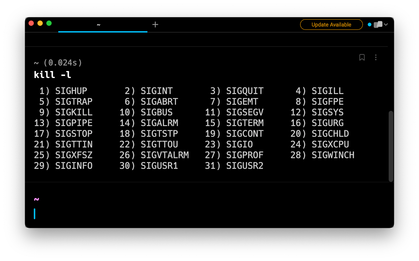 Each of these signals is also associated with a given number, as again defined in the Linux docs. Depending on the configuration of your shell, you may also be able to run kill -L to see both the signal names and numbers.