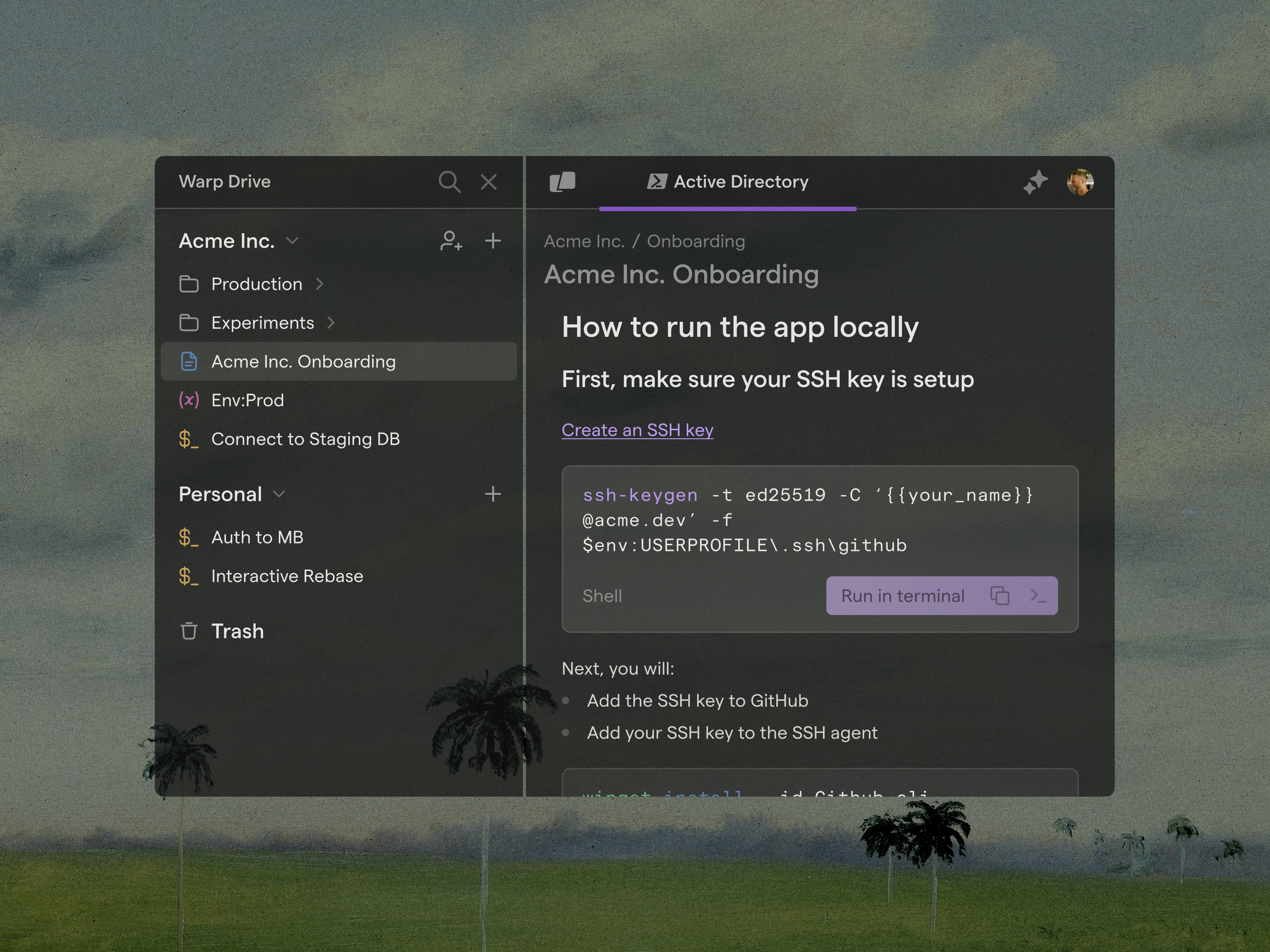Warp Drive allows you to save your most-run commands in Workflows or Notebooks, which can be shared with teammates via link. Imagine onboarding a teammate by sending your most-run commands, or creating a tutorial for using your CLI.