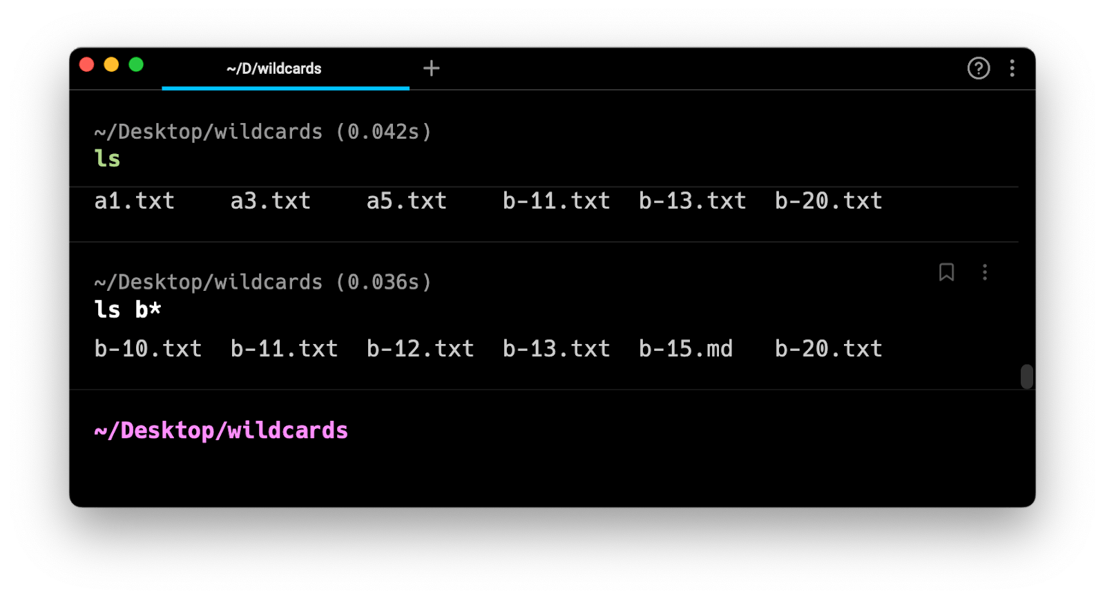 There are also square bracket operators in most shells (notably not Fish). These allow you to define a specific character set to match, e.g. myfile-[0-2].txt. That would match myfile-1.txt and myfile-2.txt, but not myfile-3.txt or myfile-10.txt. Square bracket operators can give you more granular matching than * or ?. Note that a square bracket expression can only match a single character; unlike regular expressions, there's no repeat operator. Square brackets can contain a list of individual characters that are matched, e.g. [adg] to match a, d, or g, or a range of numbers or letters to allow, specified with a hyphen between two characters. Matching is case-sensitive, so if you want to match any letter between a and z regardless of case, your expression would be [a-zA-Z]. To replicate the * operator but exclude any non-alphanumeric characters, use [a-zA-Z0-9].