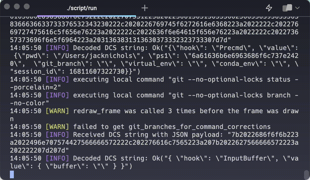 Here, a command in Warp is the combination of three grids receiving and sending characters to the shell. (Technical note: Warp also offers a default prompt instead of a customized shell prompt).