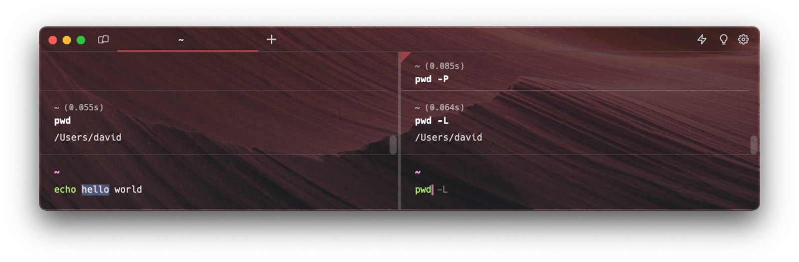 The questions in group one are about not cluttering our user interface. Another simplification came in handy: only show the cursor and additional UI elements on the focused terminal input. Additionally, the focused terminal is the only one that is actually performing checks for autosuggestions, completions, or running any other more advanced functionality. The sync “destination” terminal sessions are only receiving and applying updates to their input buffer strings. This also keeps the feature performant, which is another one of our product principles (build for speed).