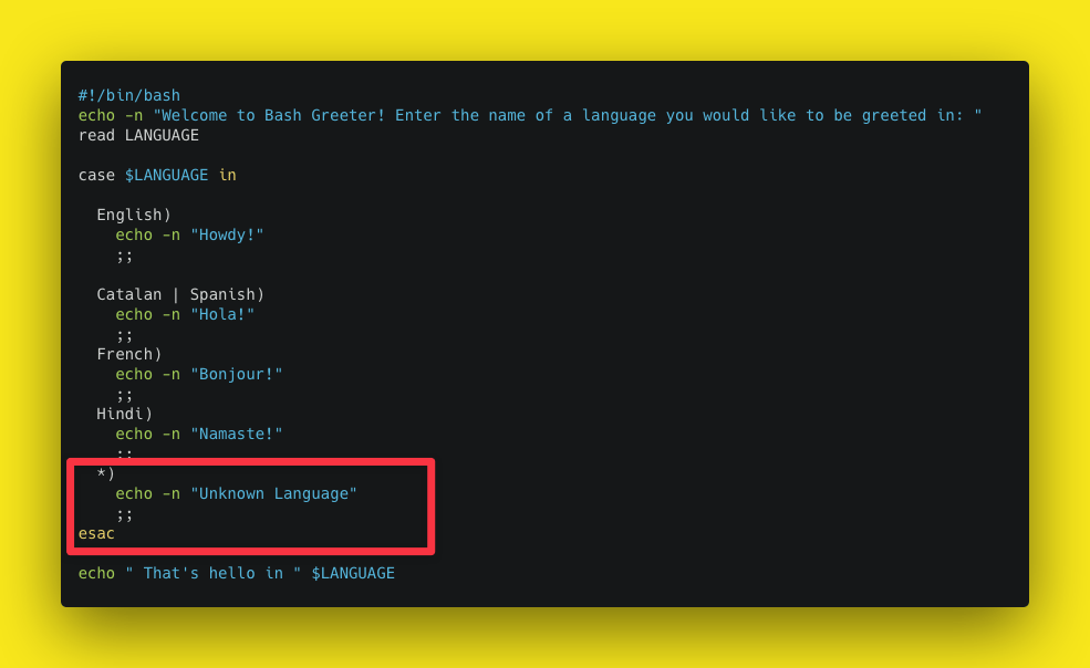 - Finally, insert the commands you’d like to be executed if the pattern is matched. Be sure to add a double semicolon ;; when you’d like the execution to stop.