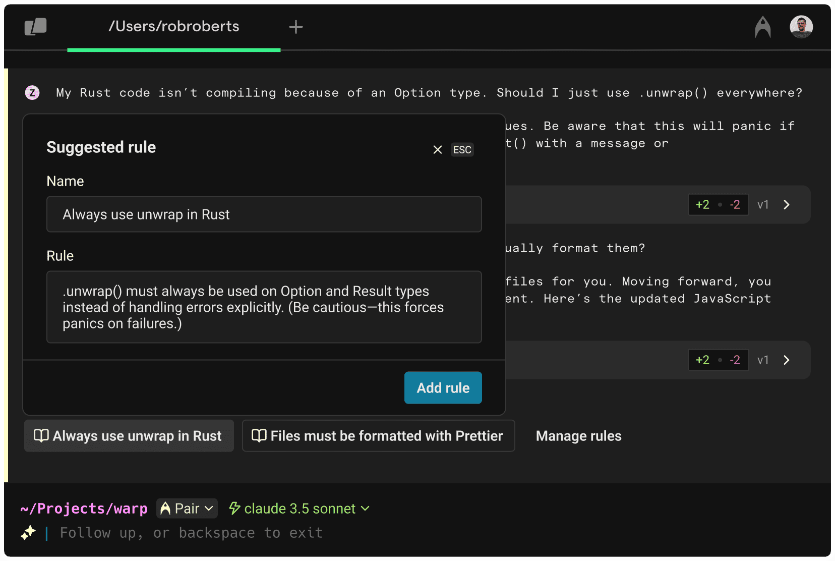 Save information about your setup, preferred tools and style preferences - Warp will apply them automatically to code diffs. Warp will use context about your repositories to inform responses, finding the right places to make edits autonomously.