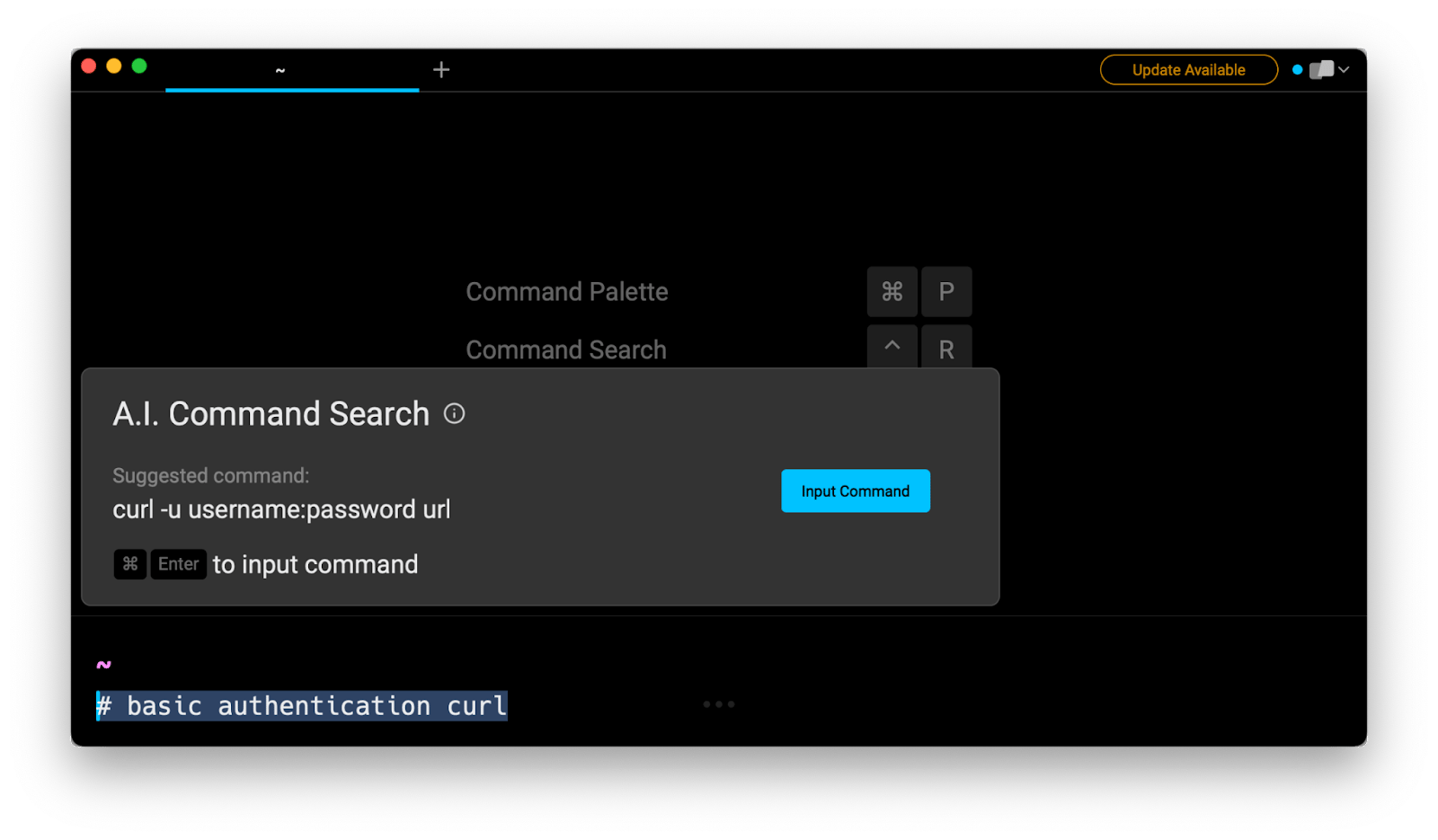 Entering basic authentication curl in the AI Command Search prompt results in exactly curl -u username:password url, which you can then quickly insert into your shell by doing CMD+ENTER.