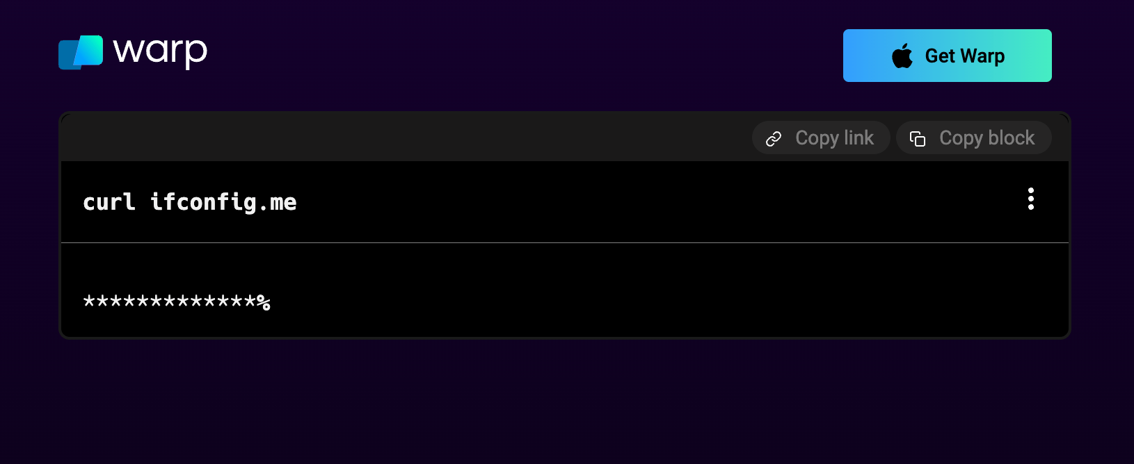 Warp is unique from other terminals in that you can share blocks of command line input and output on permalinks which can be opened in a browser or embedded. Block sharing can be especially useful when you’re collaborating or debugging with your team at work.