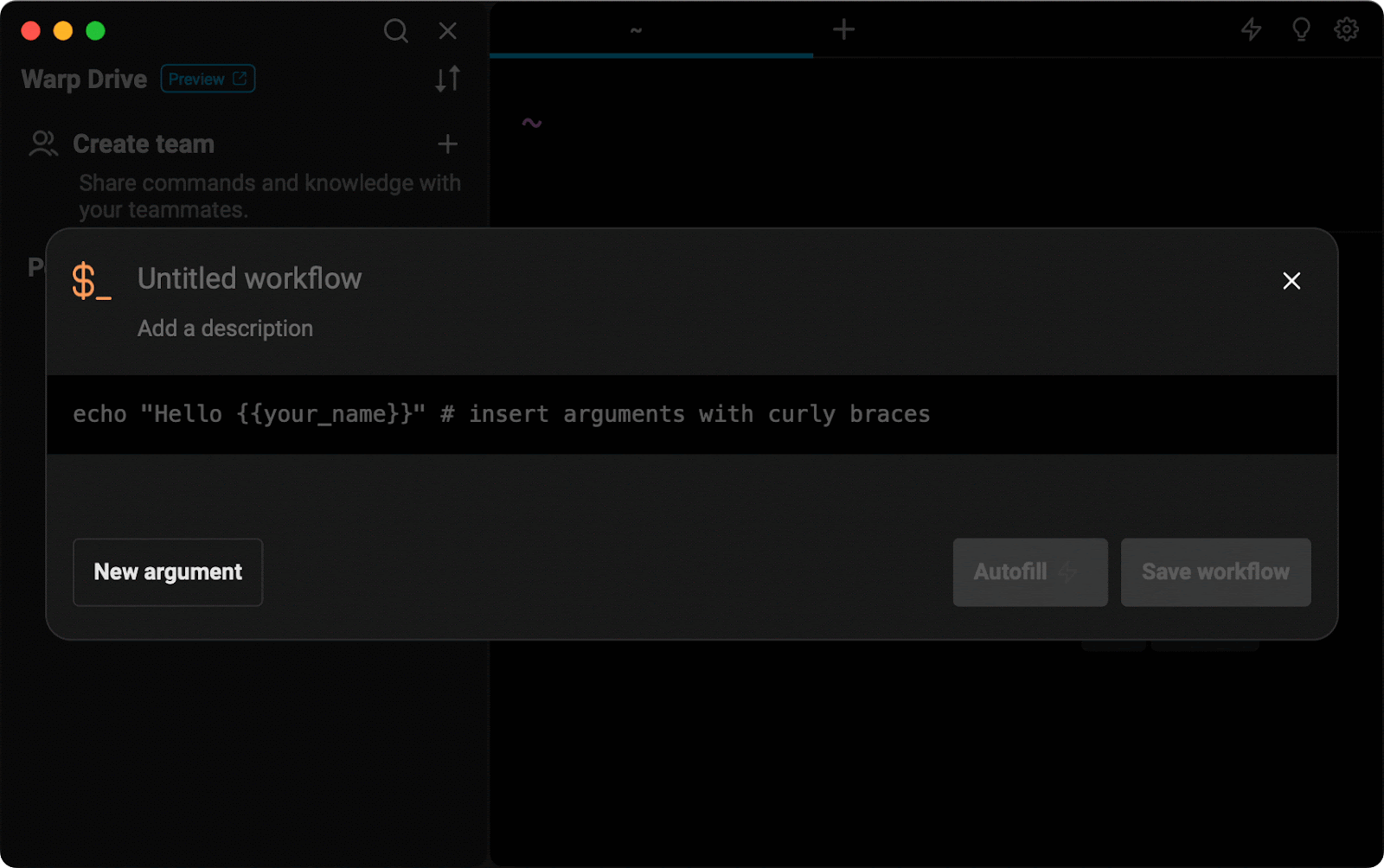Now Warp AI can autofill names and descriptions for the command and its parameters when you’re adding new workflows to Warp Drive. If you have a particularly complex command, Warp will even templatize it for you.