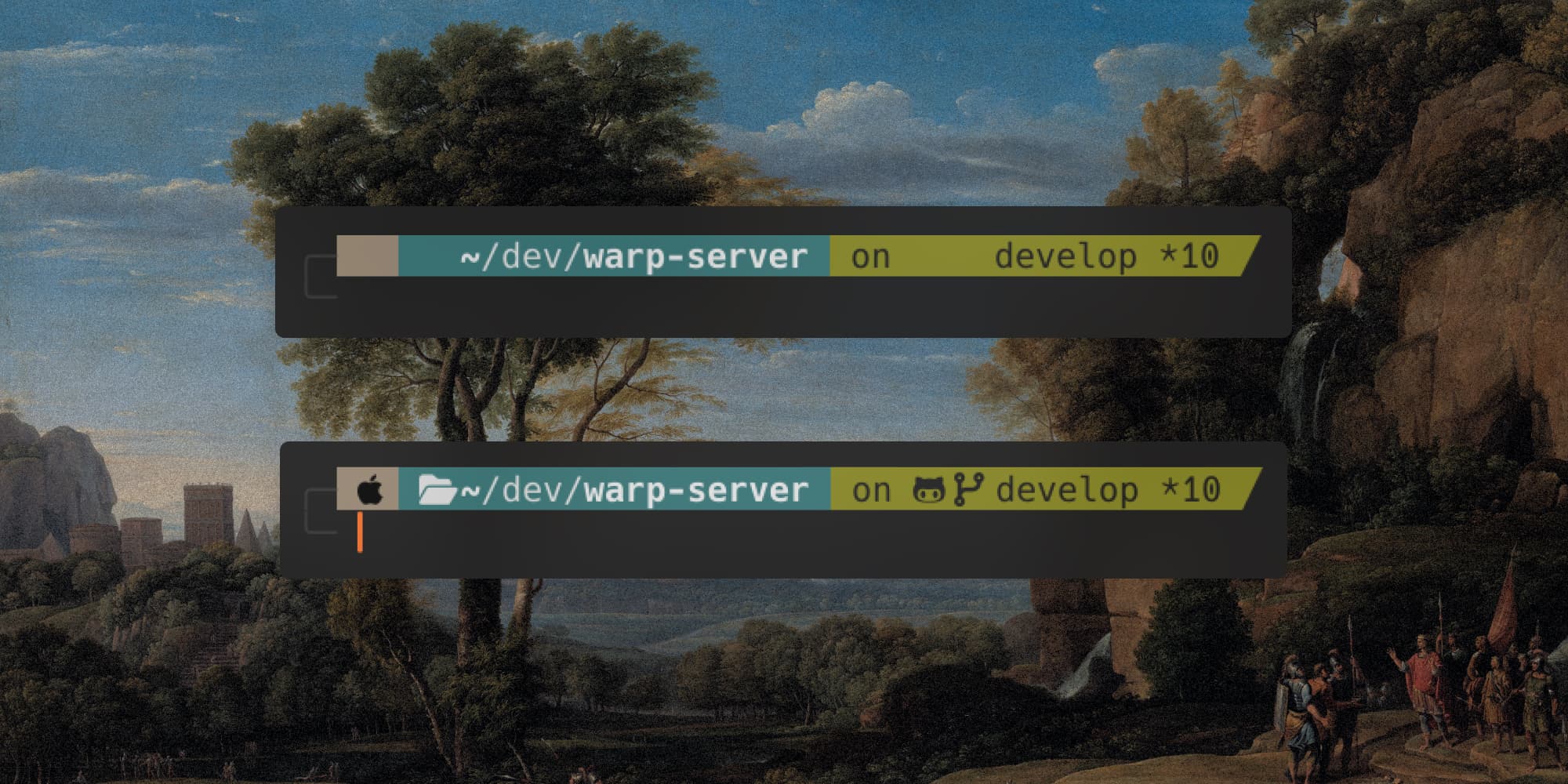 A Powerlevel10k prompt in Warp on web, before and after font fallback.