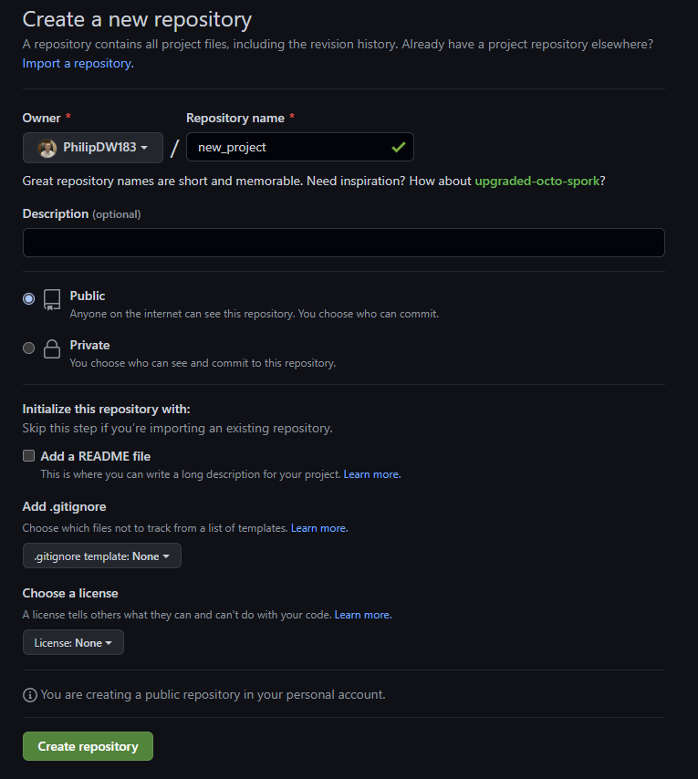 First you need to make a remote repository. To do this, we’ll use GitHub as an example, but other remote repository options like GitLab and BitBucket would work similarly. On GitHub, create a new empty repository. Give it a name and set whether you want to make it public or private. This should look something like this: