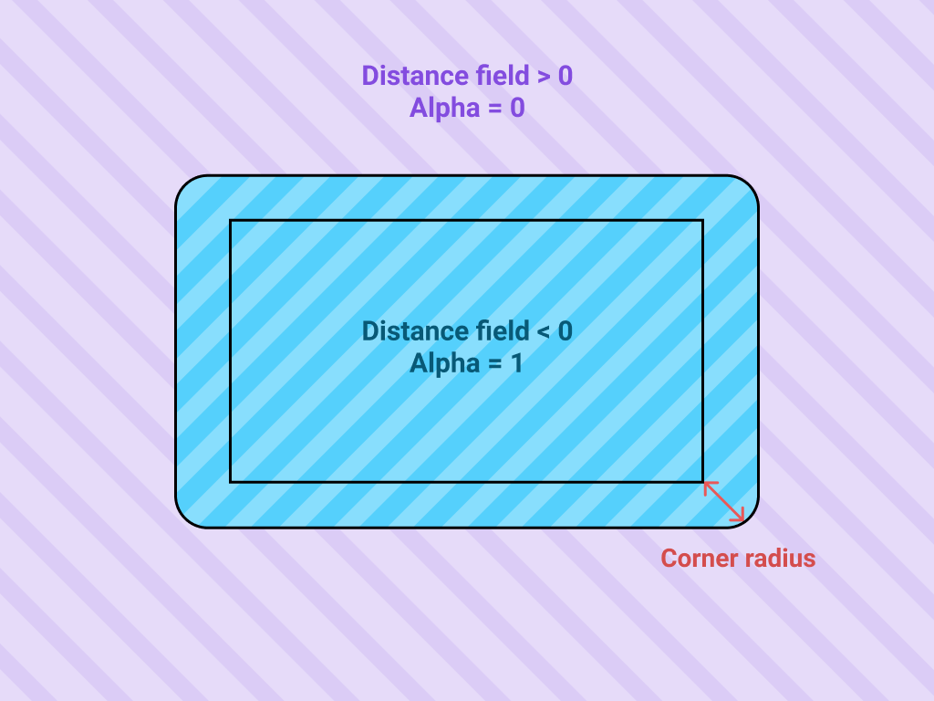 We derive the new rectangle corner of the shrunk rectangle by subtracting the corner radius from the original rectangle corner. We want pixels outside the shape to be transparent, i.e. for the alpha channel of its color to be 0. And pixels inside to be opaque, i.e. alpha=1.