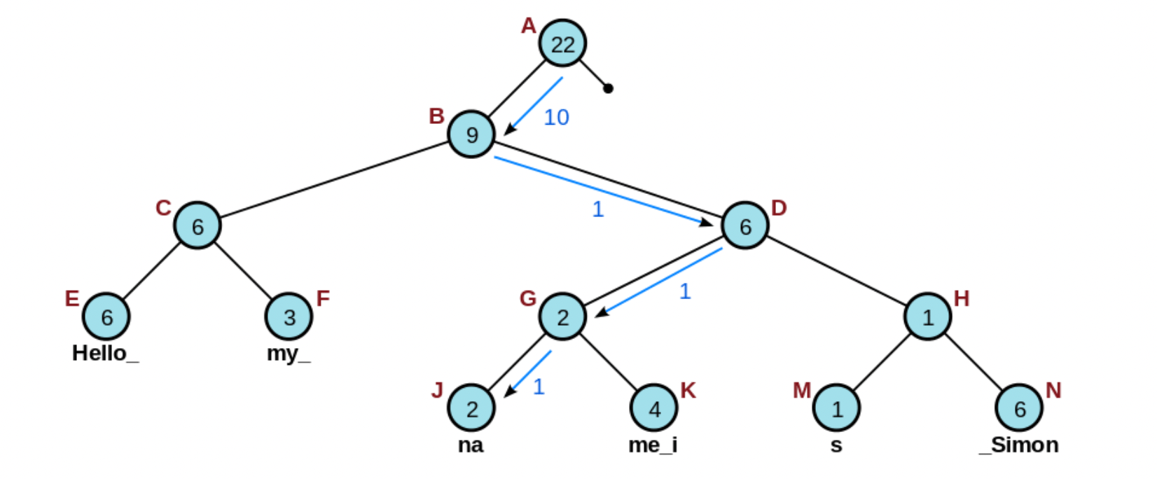 An example of indexing into a specific node of a Rope, given a character offset of 10 (credits to Wikipedia)