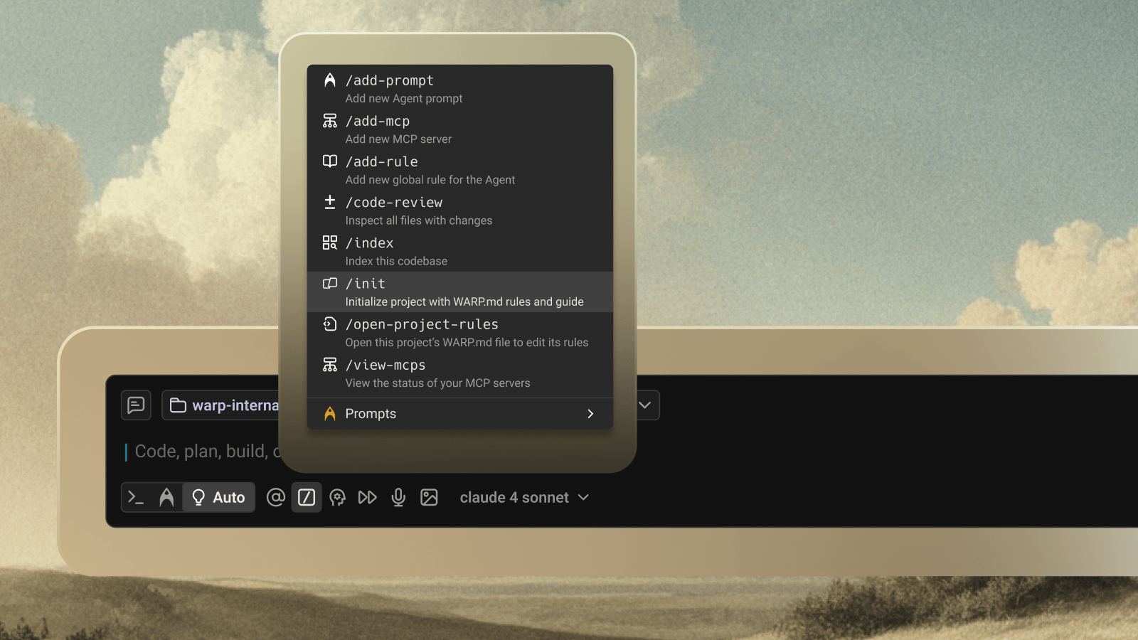 If you have an existing project, you can now run /init (and a host of other slash commands) to bootstrap it with a version-controlled WARP.md file. Warp also supports AGENTS.md, CLAUDE.md and Cursor rules.