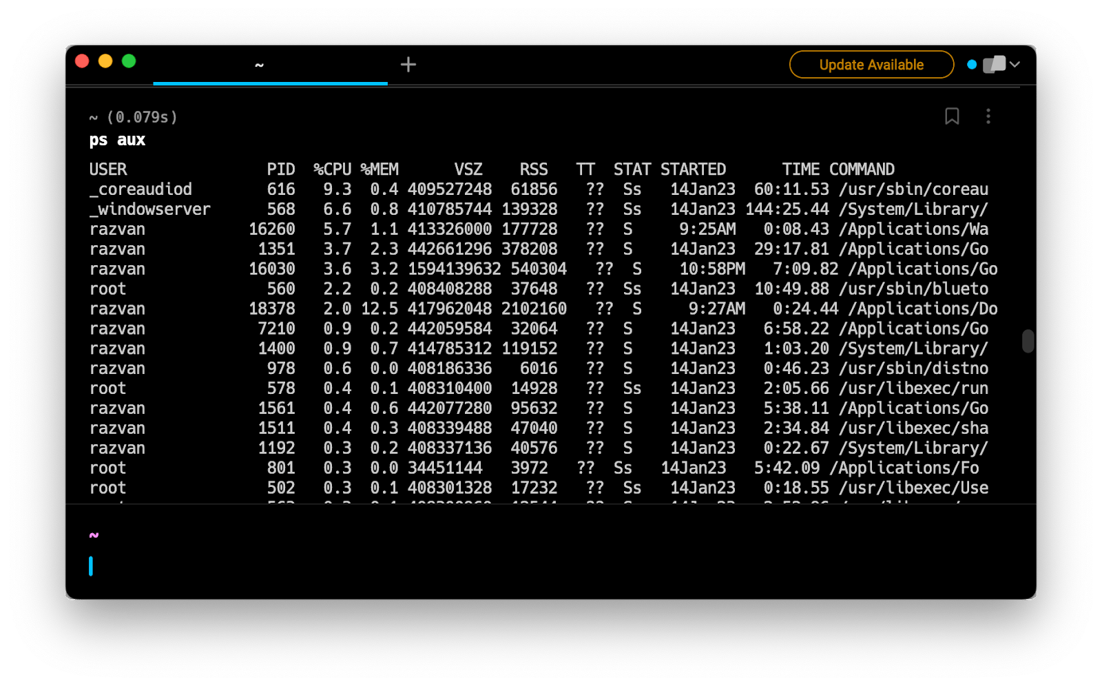 Alternatively, to list all processes running on your machine, consider ps aux or top: