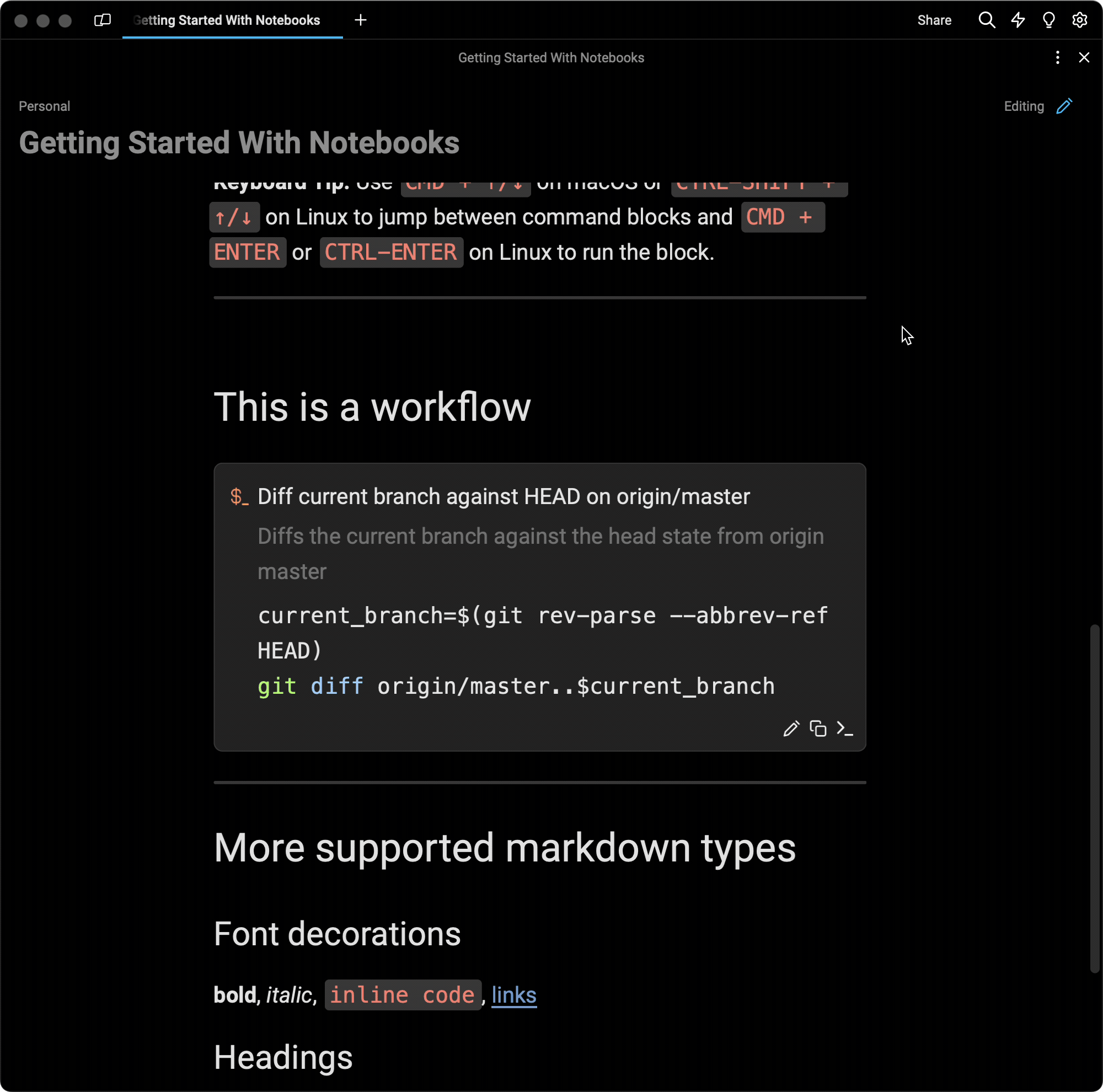 Notebooks are like runbooks that live next to your command line in the terminal. They’re easy to find, run, and edit. Every Notebook can include executable commands or Workflows, so you can step through multi-step playbooks without copy, pasting, or context-switching. Plus, you can export Notebooks in Markdown format, so there’s no lock in.