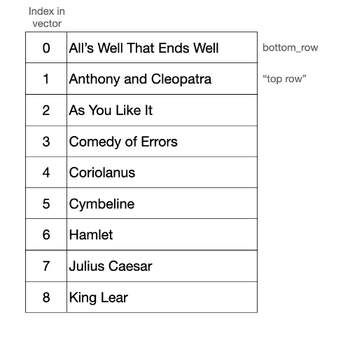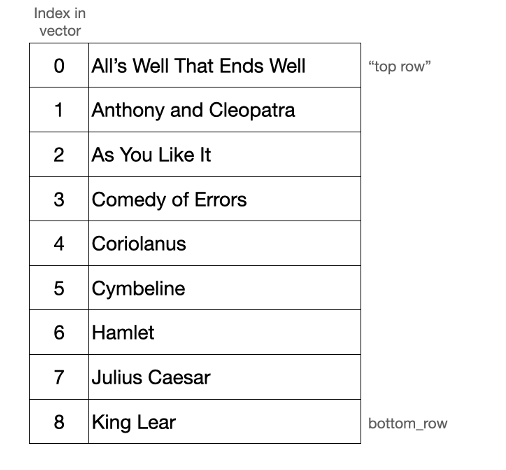 Warp’s grid is a circular buffer that stores rows sequentially in a vector. Say, for example, you create a grid storing a subset of Shakespeare plays that are sorted alphabetically. How this renders on screen and how this is stored internally might look something like this: