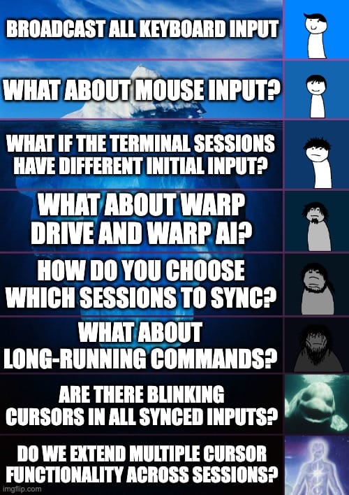 We discussed all of this in a project kick-off/design jam meeting. We played around with the broadcast input feature in other terminals to decide what we liked and didn’t like. We found it was mostly great. The main problem we faced was how we could port this feature into Warp, as mentioned above.
